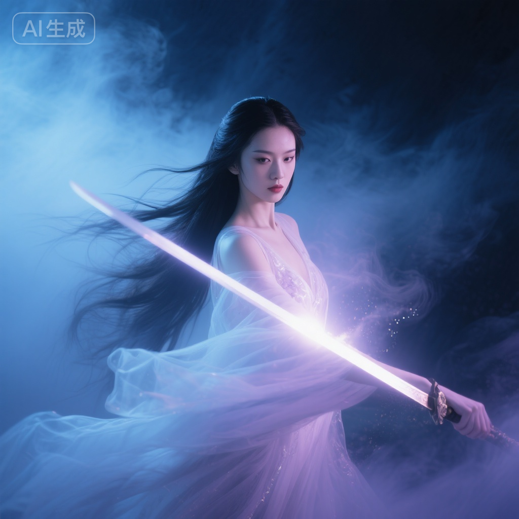 具有独特艺术感的图片,以胶片质感呈现超现实与梦核氛围融合的画面。主体是一位东方妖姬的正面特写,她的身体散发柔和光芒,长发在风中飘动。妖姬以探海式舞剑,于暗夜低光、浅蓝淡紫渐变且磨砂朦胧的场景中形成逆光动感影像,发丝有高光且飘逸。画面低饱和高反差,有透视畸变抽象的构图,生物发光元素和漫射光营造破碎奢华感,背景是深蓝色调混合烟雾,增加梦幻略暗的气氛,还伴有挥剑拖影、泛光模糊晕染和颗粒噪点,以4K分辨率呈现。