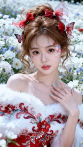 艺术唯美写真,仙气飘飘,真人实景拍摄,光线充足,拍摄清纯校花微圆脸可爱女孩半身照,浅栗棕色慵懒时尚唯美森系发型,脸部皮肤如白瓷一样光滑,超白皮肤水嫩,脸部皮肤剔透泛着光泽,瓷白如玉、极其华面,水嘟嘟裸唇,丰富细节。氛围感网红妆容,脸部高清眼部细碎花瓣装饰特写,大红唯美灵动极繁杂轻纱不规则蝴蝶结发夹戴在头上,几个不规则飘逸灵动蝴蝶结发夹,非常唯美,冷白色调,色彩对比鲜明,神秘氛围,细腻笔触,满画面非常有层次感,构图优美,绝美角度拍摄,唯美花海里,唯美花朵,极致浪漫,极繁风格,满画面构图,新中式,美女,古典美人,棕色超细睫毛,深棕黑色瞳孔,深情的看着镜头,冷白色调,穿碎超宽双层一字肩弹力大红色刺绣亮片装饰白色毛毛的极繁杂工艺唯美礼服裙,凌乱弯曲发丝美,优美手指舞,渐变色清新美甲,